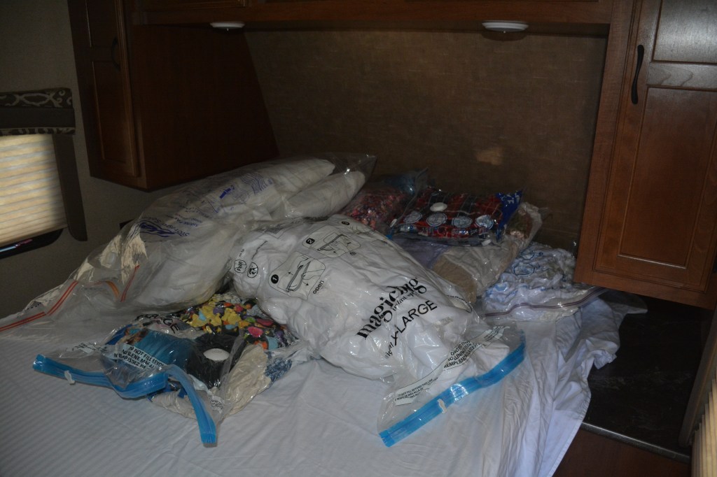 I remove and wash all the linens, and prep them for storage with vacuum bags. (see Winterizing: Linens and Soft Goods for details). I remove all liquid cleaning supplies, sunscreen, bug spray, toiletries, etc that should not freeze over the winter. I cover the bare master bed mattress with an old king sized top sheet.