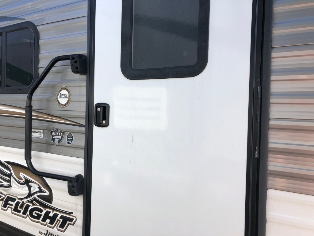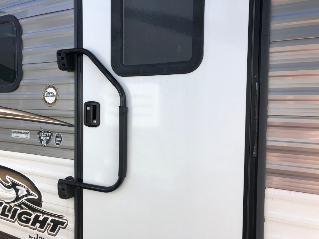 We use the position of the front door handle as a visual indicator to show if the trailer interior is ready to tow. When the door handle is out or in the left position, the interior of the trailer is NOT ready to tow and damage could occur. If the door handle is in the right position over the door, the interior of the trailer has been walked down and is ready to tow.